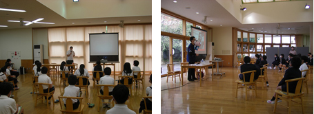 例年、各教室にて歯垢染め出しと歯磨き指導主体の生徒参加型授業を実施してきましたが、今年度は感染予防のためランチルームに場所を移して講話中心の授業を行いました。